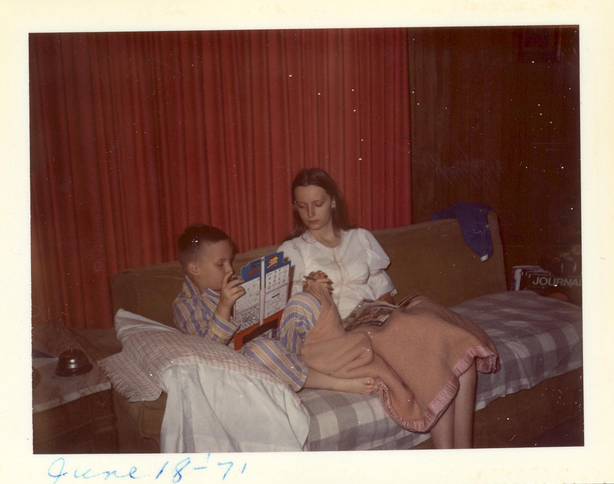 PicId: scan4084 Group: Album, Hersheys 1970-1972 Where: 9 Alger Place, Grosse Pointe, MI When: 10-15-1970 Subject(s): Patricia Kay Hershey; Michael David Hershey Comments: Pat and Mike recuperating at home after tonsillectomies done at Detroit Memorial Hospital |