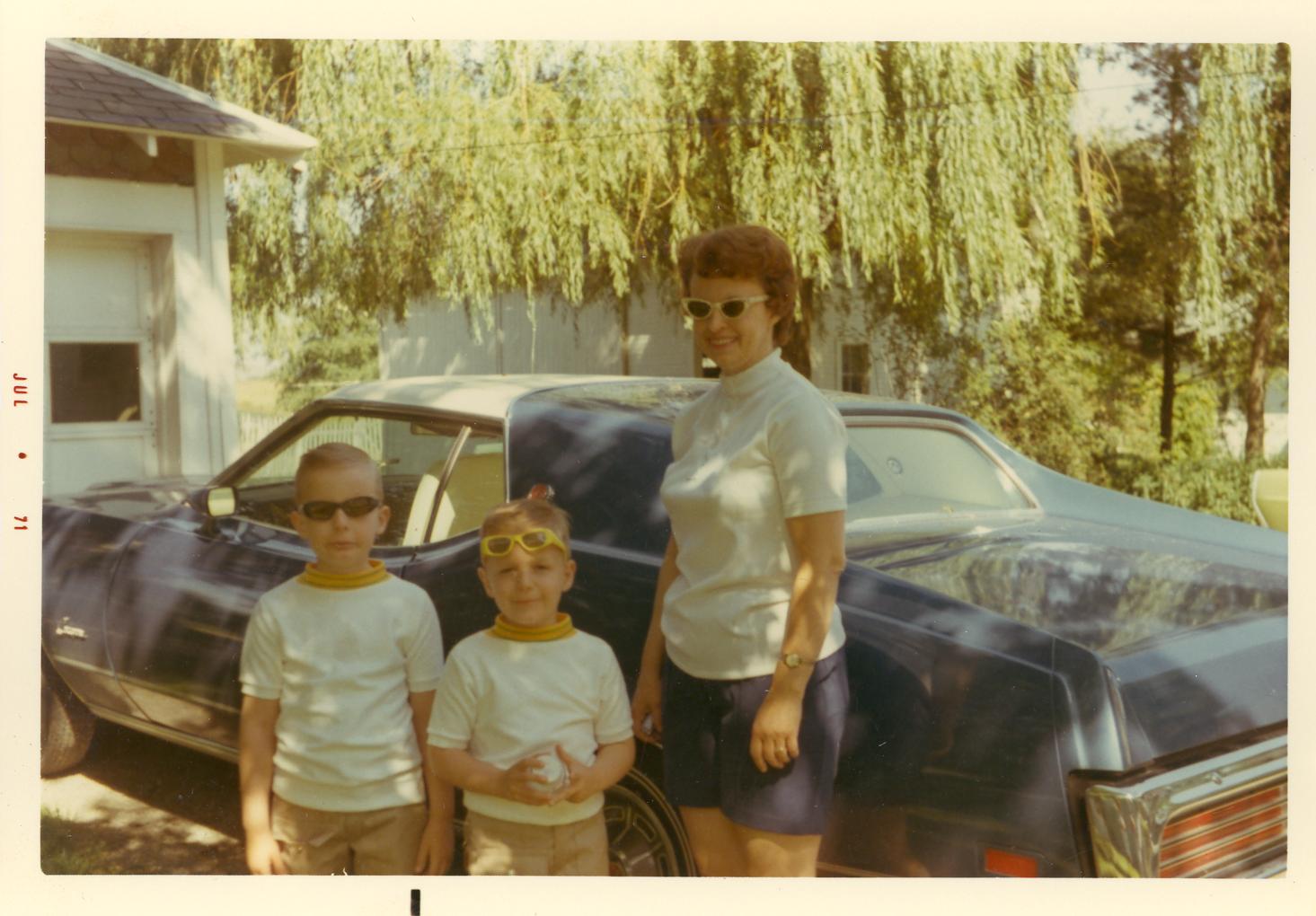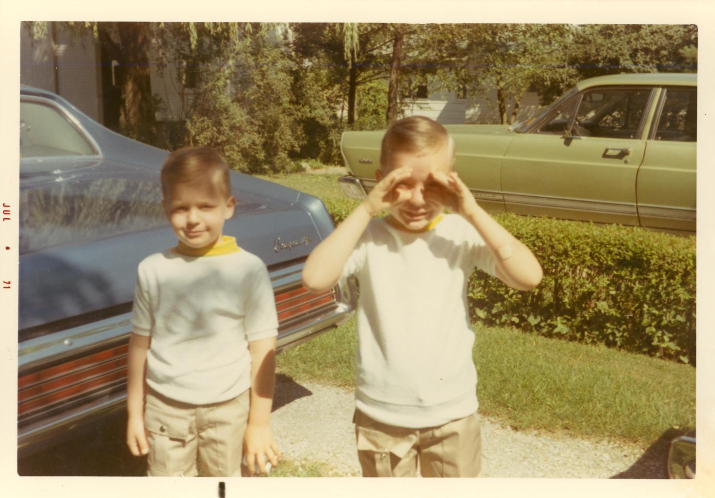 PicId: scan4097 Group: Album, Hersheys 1970-1972 Where: Grandma Polly's House, Churubusco, IN When: 07-01-1971 Subject(s): Michael David Hershey; Joseph Raymond Hershey Comments: Notice our 1970 blue and white cougar auto in back. It was a beauty but hard to see out of in back and sides. |