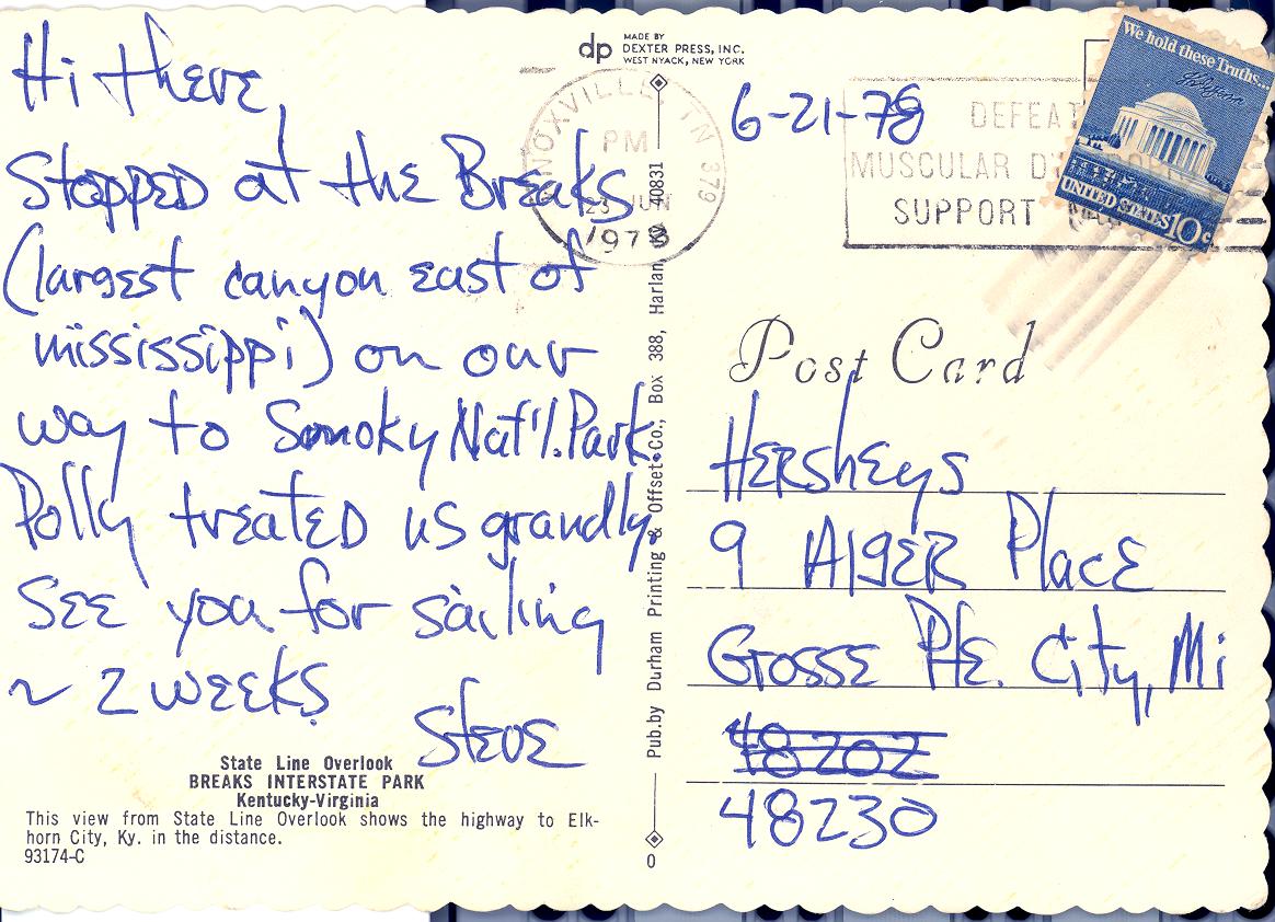 PicId: scan5350 Group: Album, Hersheys 1977-1979 Where: Unspecified When: 06-21-1978 Subject(s): Unspecified Comments: Post card sent by Steve from Breaks Interstate Park--Kentucky-Virginia on a motorcycle trip Stopped on way to east and saw Polly |