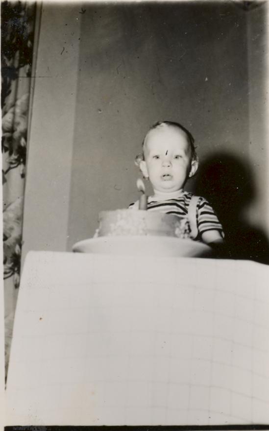 PicId: scan0073d Group: Birthday, Allen Where: Indiana When: 07-05-1951 Subject(s): Ernest Allen Hershey, III Comments: Al with bday cake on his 2nd birthday at Aunt Florence’s basement at Lake Webster, IN (really cute little green overalls |