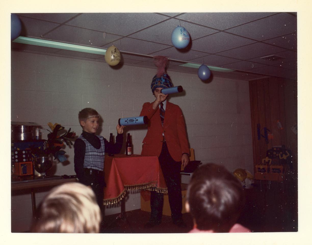 PicId: scan4131 Group: Birthday, Joseph Where: 9 Alger Place, Grosse Pointe, MI When: 09-25-1973 Subject(s): Joseph Raymond Hershey Comments: Joe helping magician,Jim Lierzer |