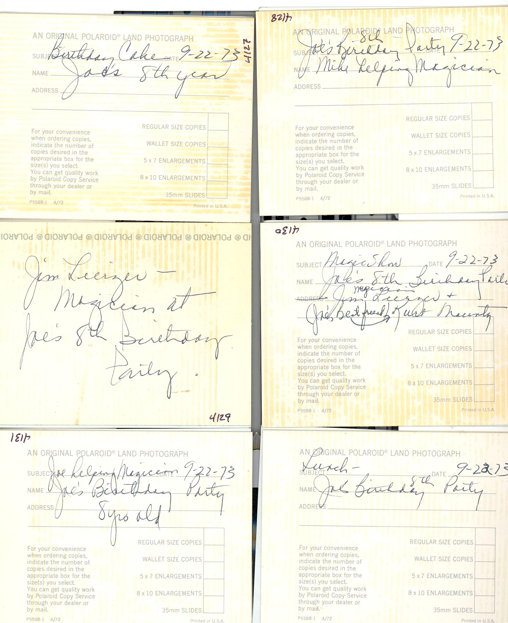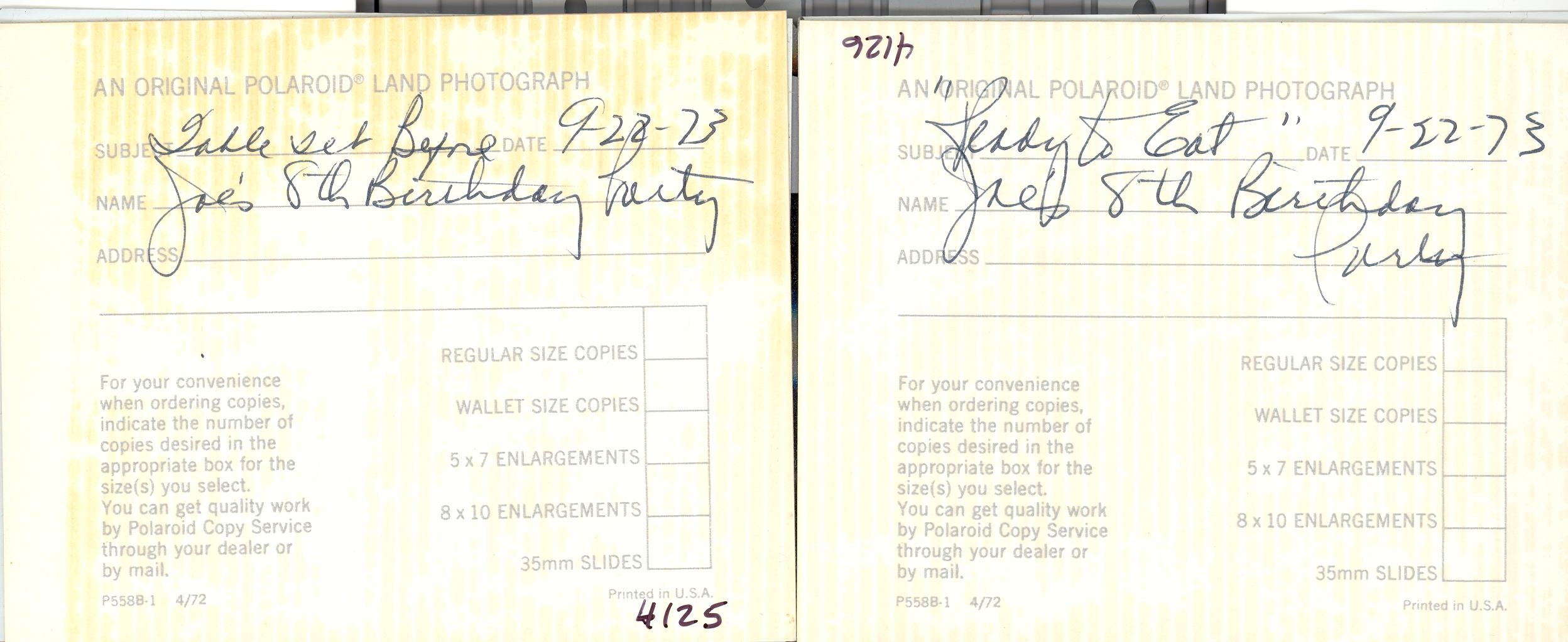 PicId: scan4134 Group: Birthday, Joseph Where: 9 Alger Place, Grosse Pointe, MI When: 09-25-1973 Subject(s): Unspecified Comments: ID writing on back of Joe's birthday pictures |