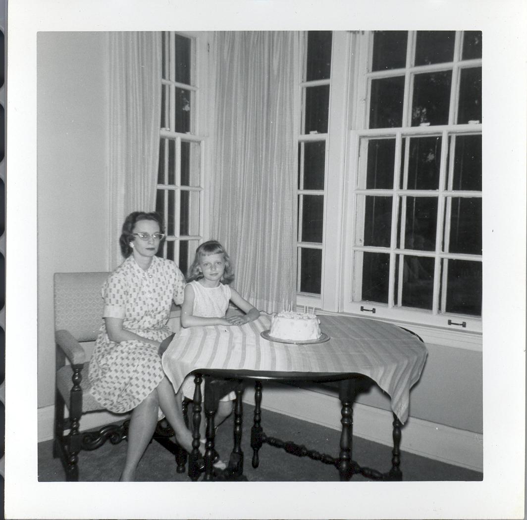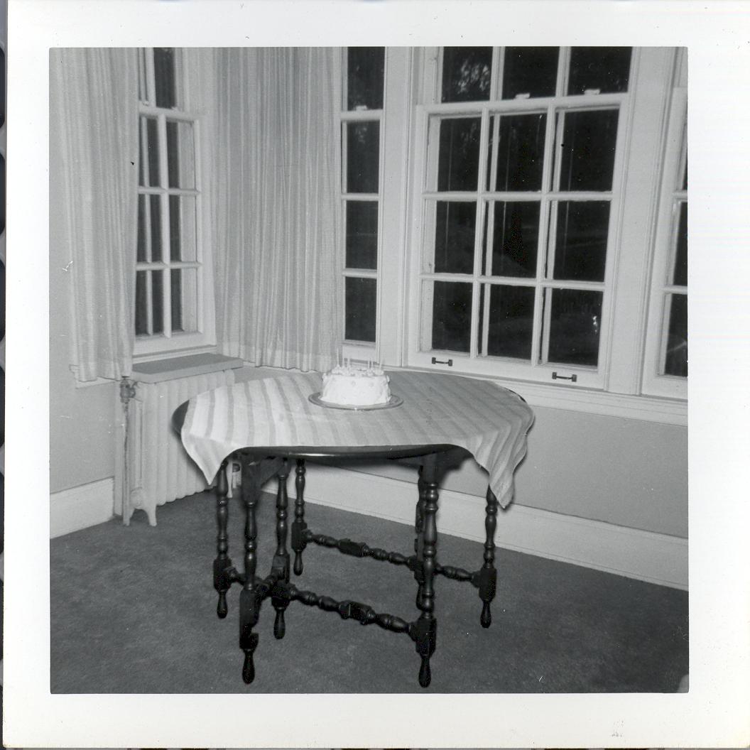 PicId: scan1123 Group: Birthday, Pat Where: 798 Berkshire, Grosse Pointe, MI When: 06-01-1961 Subject(s): Kathleen Kay Hershey Comments: Mom with traditional angel food cake in dining alcove |