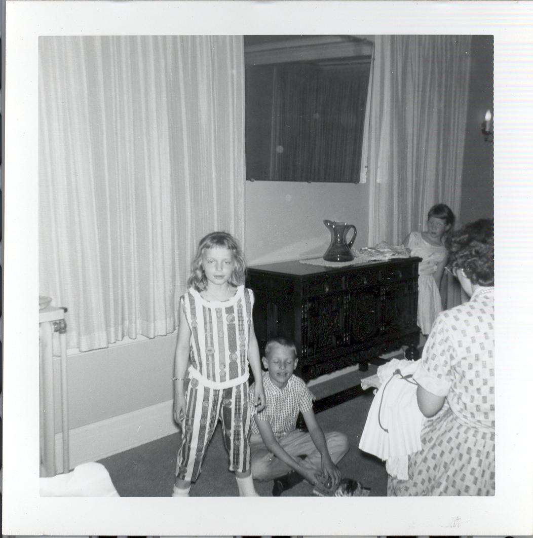 PicId: scan1126 Group: Birthday, Pat Where: 798 Berkshire, Grosse Pointe, MI When: 06-01-1961 Subject(s): Kathleen Kay Hershey; Patricia Kay Hershey; Stephen Douglas Hershey Comments: Pat trying on clothes she received for birthday |