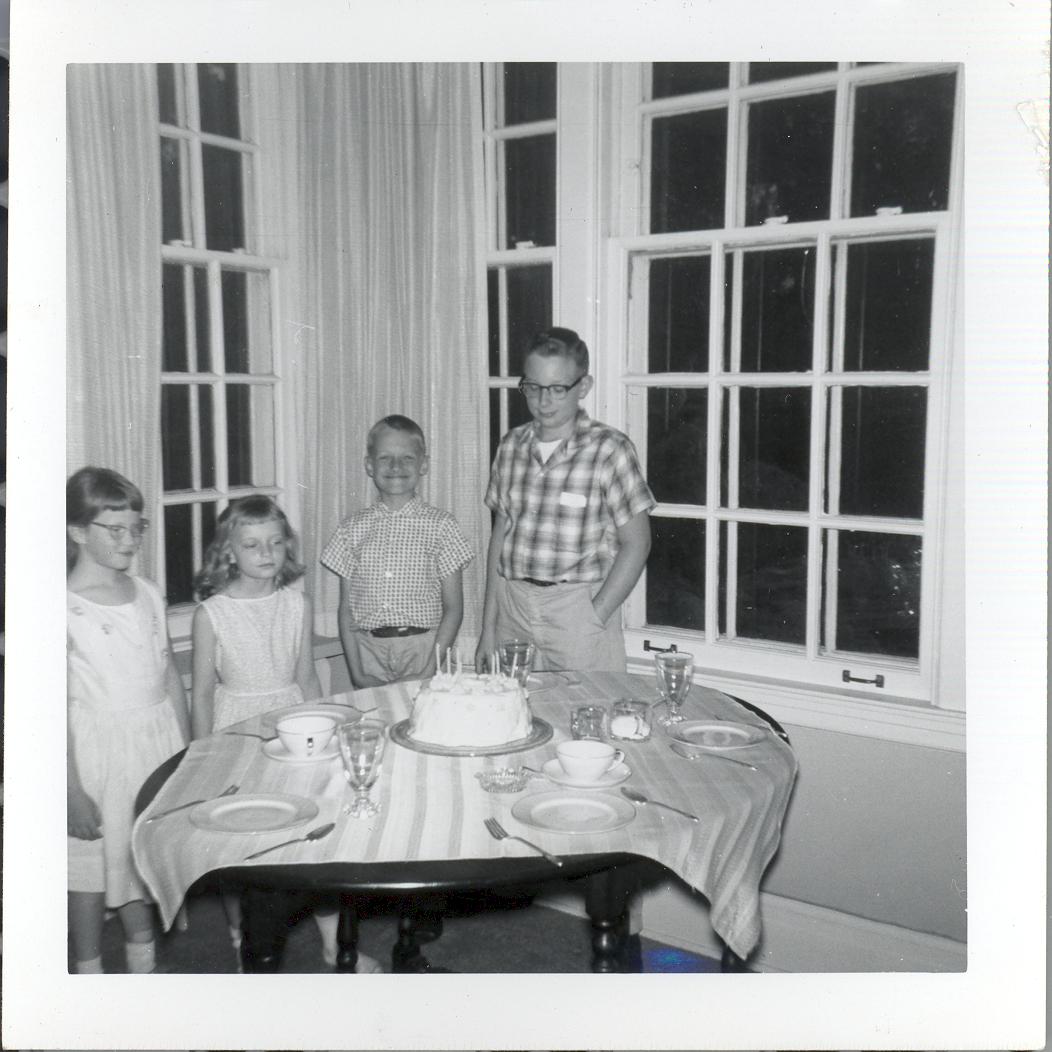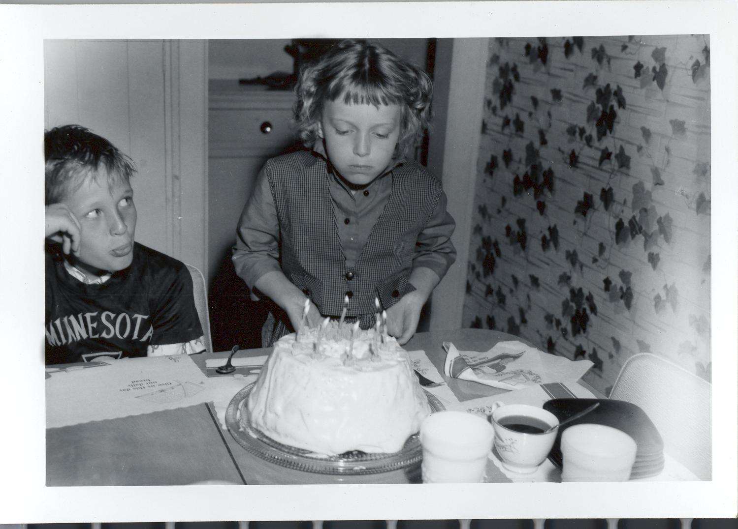PicId: scan1162 Group: Birthday, Pat Where: 798 Berkshire, Grosse Pointe, MI When: 06-01-1962 Subject(s): Patricia Kay Hershey; Stephen Douglas Hershey Comments: Pat blowing out candles. Was not feeling very good for she came down with chicken pox the next day. Steve had just come home from Little league game and was taking the stage for he had hit the winning home run |