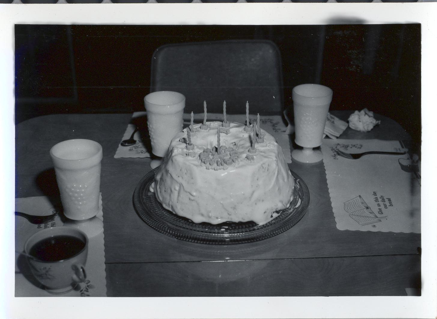 PicId: scan1159 Group: Birthday, Pat Where: 798 Berkshire, Grosse Pointe, MI When: 06-01-1962 Subject(s): Unspecified Comments: Famous angel food cake for birthdays--Pat's 8th BD |