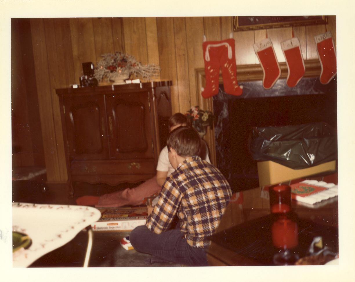 PicId: scan4149 Group: Christmas Where: 9 Alger Place, Grosse Pointe, MI When: 12-25-1973 Subject(s): Michael David Hershey; Joseph Raymond Hershey Comments: Posing in front of the fireplace in the living room |