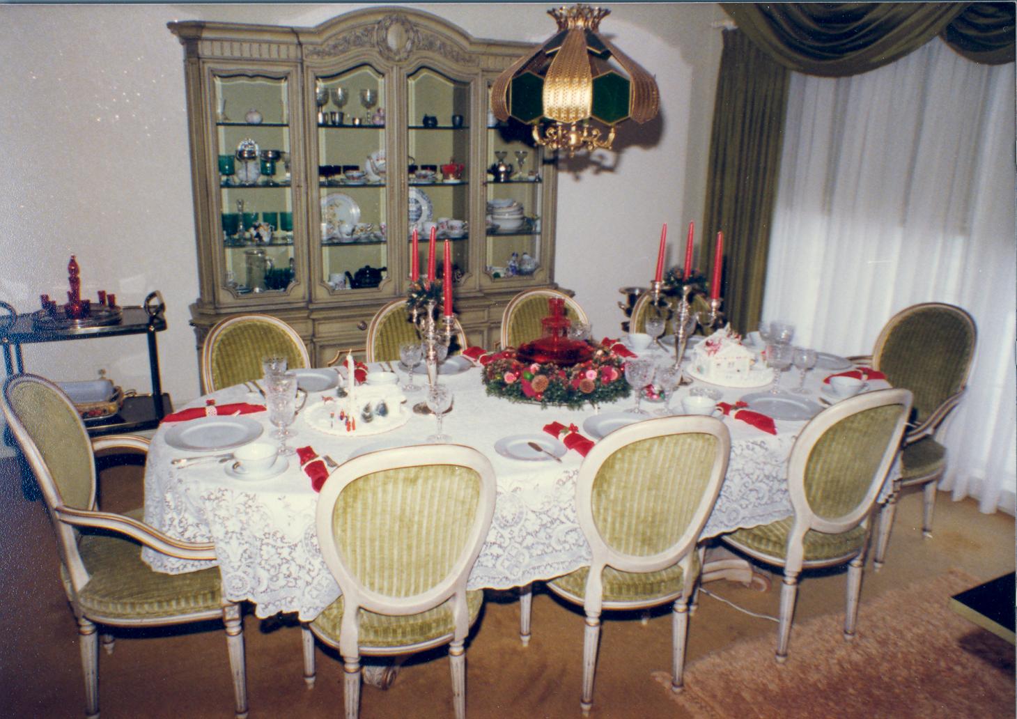 PicId: scan5311g Group: Christmas Where: 9 Alger Place, Grosse Pointe, MI When: 12-25-1977 Subject(s): Unspecified Comments: Dining Room table set for Christmas dinner--make note of sugar church and sugar house mom made on either end with familiar red fountain flowing in middle |