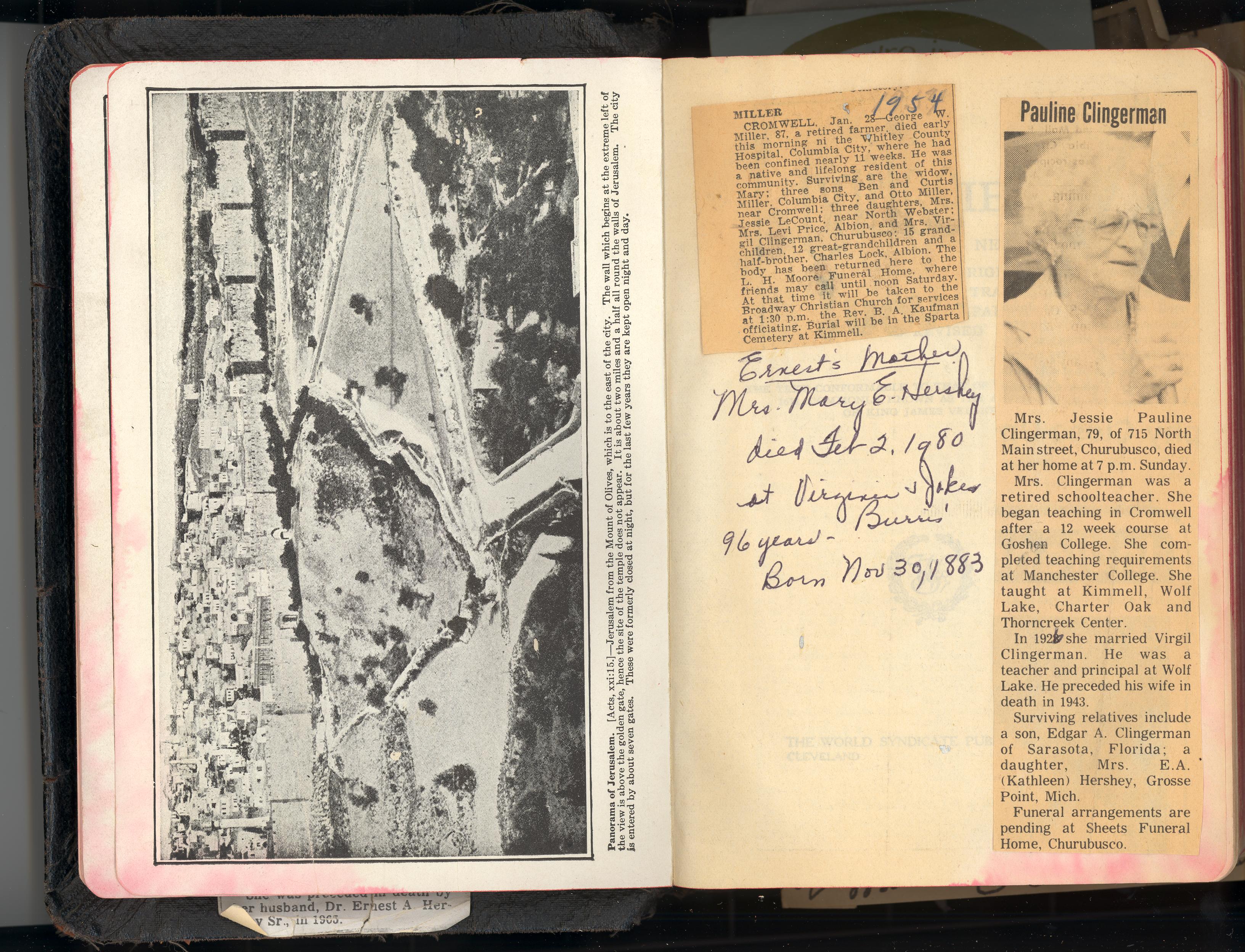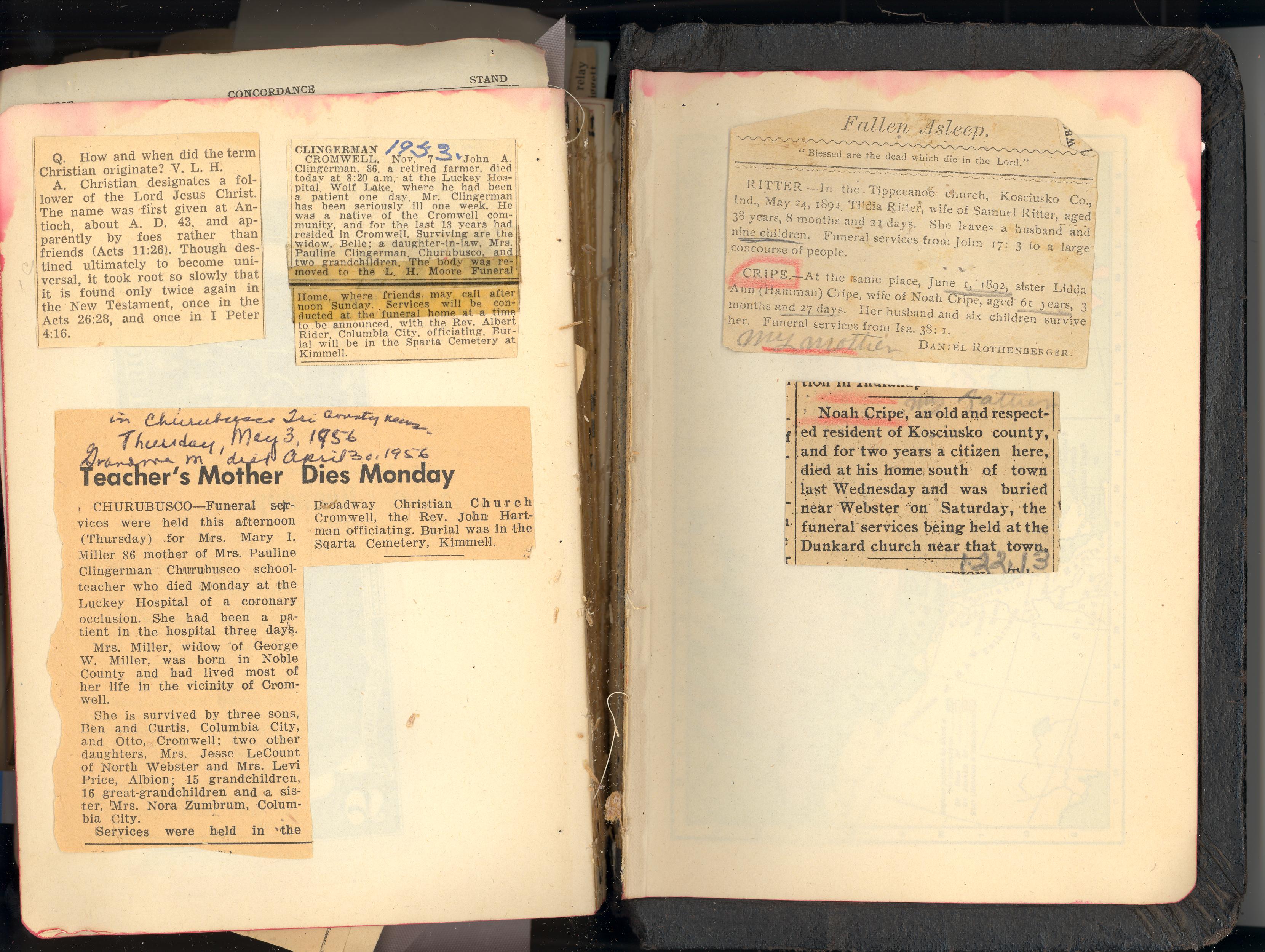 PicId: scan3064 Group: Misc Where: Unspecified When: Unspecified Subject(s): Grandma Miller; Grandpa Clingerman Comments: Obituaries in Mom's Bilble: Grandma M--Died May 3, 1956-age 86 of coronary occlusion Also Grandpa C.--Died Nov. 1953 -age 86 of stroke--Both at Wolf Lake Hospital Also Grandma C's mother--Lidda Hammond Cripe--Died May 24, 1892--age-61 |