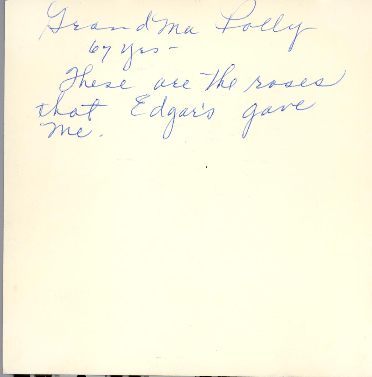 PicId: scan2234 Group: Misc Where: Unspecified When: 03-06-1957 Subject(s): Unspecified Comments: Back of previous picture of Grandma Polly and roses written by Polly |