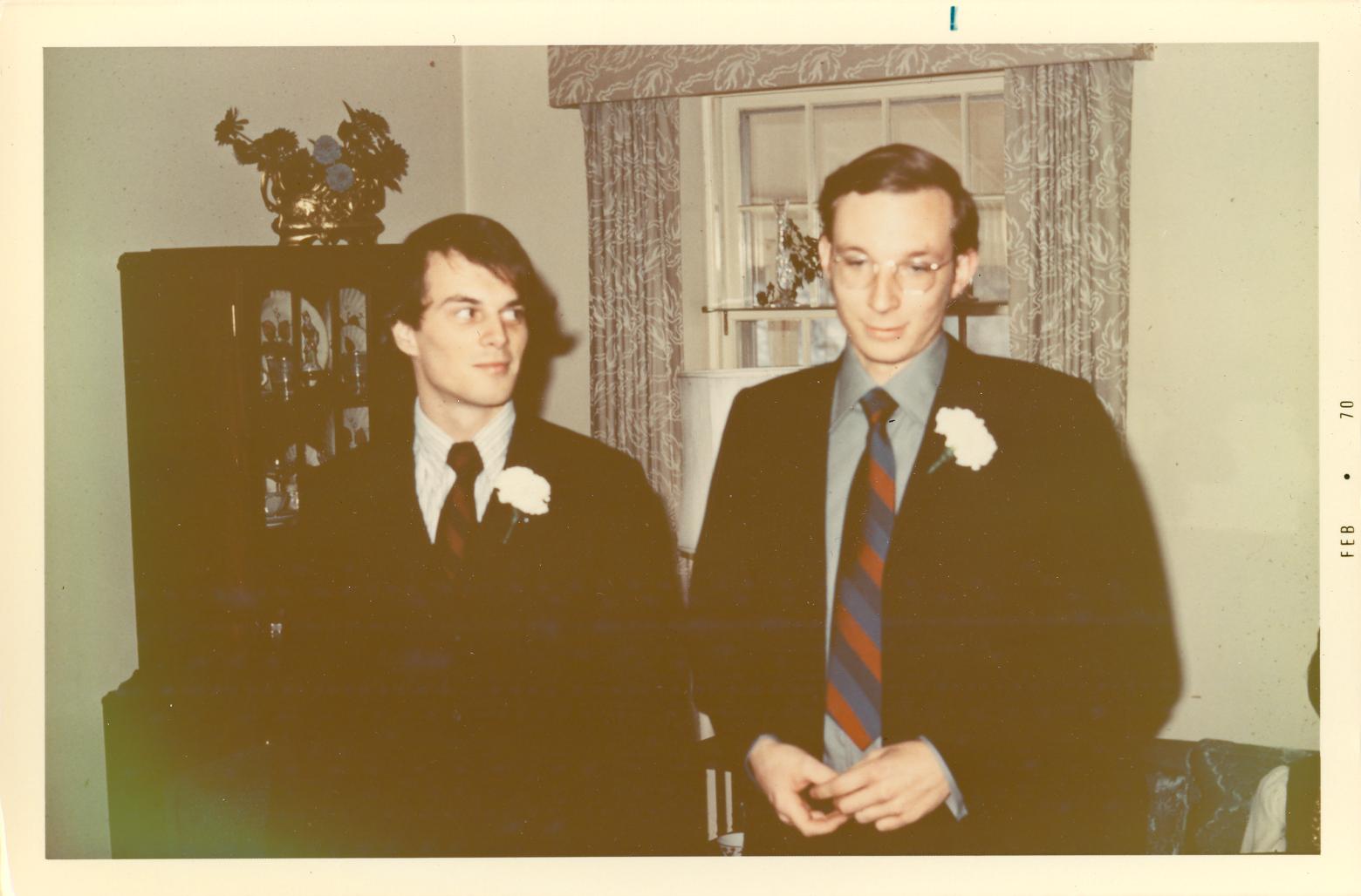 PicId: scan3049 Group: Wedding, Allen Johanna Where: Westport, CT When: 12-20-1969 Subject(s): Ernest Allen Hershey, III Comments: Allen with his Best Man, Robert Taylor. |