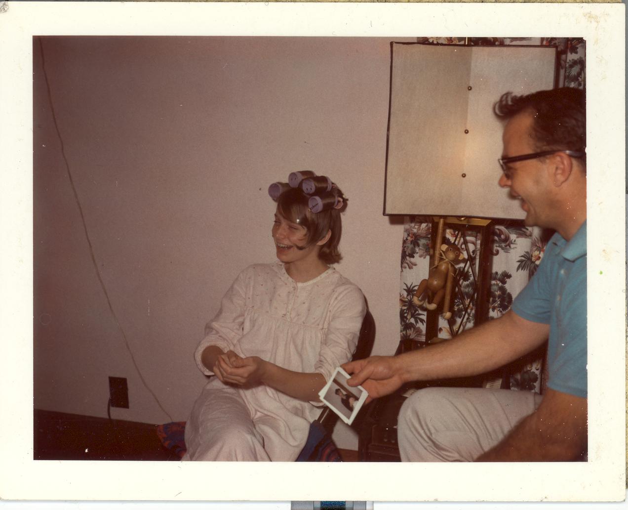 PicId: scan2297 Group: Misc Where: Grandma Polly's House, Churubusco, IN When: 07-01-1968 Subject(s): Patricia Kay Hershey; Edgar Allen Clingerman, Sr. Comments: Horsing around at Grandma Polly's--Notice the famous monkey in background |