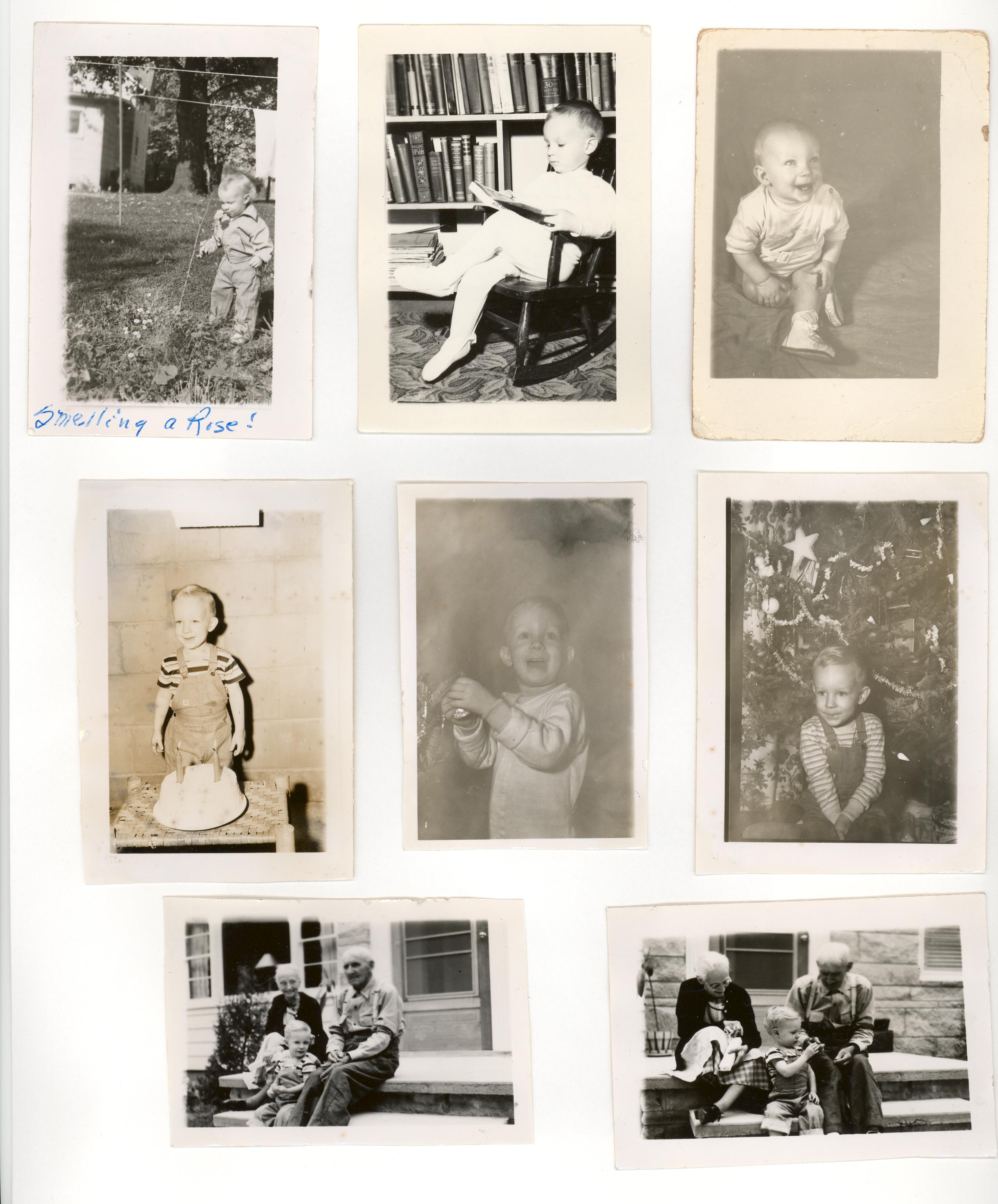 PicId: scan0073 Group: Misc Where: All over (see below) When: Unspecified Subject(s): Ernest Allen Hershey, III Comments: Frist Row: 1950 Al smelling rose in Polly’s backyard 1952 Al in living room at Hoosier Courts, Bloomington, IN “Rock me, love me, tell me tory” Reading Mary Had a Little Lamb 1949 Al at 5 mos. old; 10 Beals St., Brookline, MA Second Row: 1951 Al with bday cake on his 2nd birthday at Aunt Florence’s basement at Lake Webster, IN (really cute little green overalls 1951 Al at Christmas at Polly’s at Busco; Dad had a terrible time getting just the pic he wanted 1951 Al at Christmas at Polly’s at Busco Third Row 1951 Al w/Grandma & Grandpa Miller at Aunt Florence’s at Lake Webster, IN 1951 same |