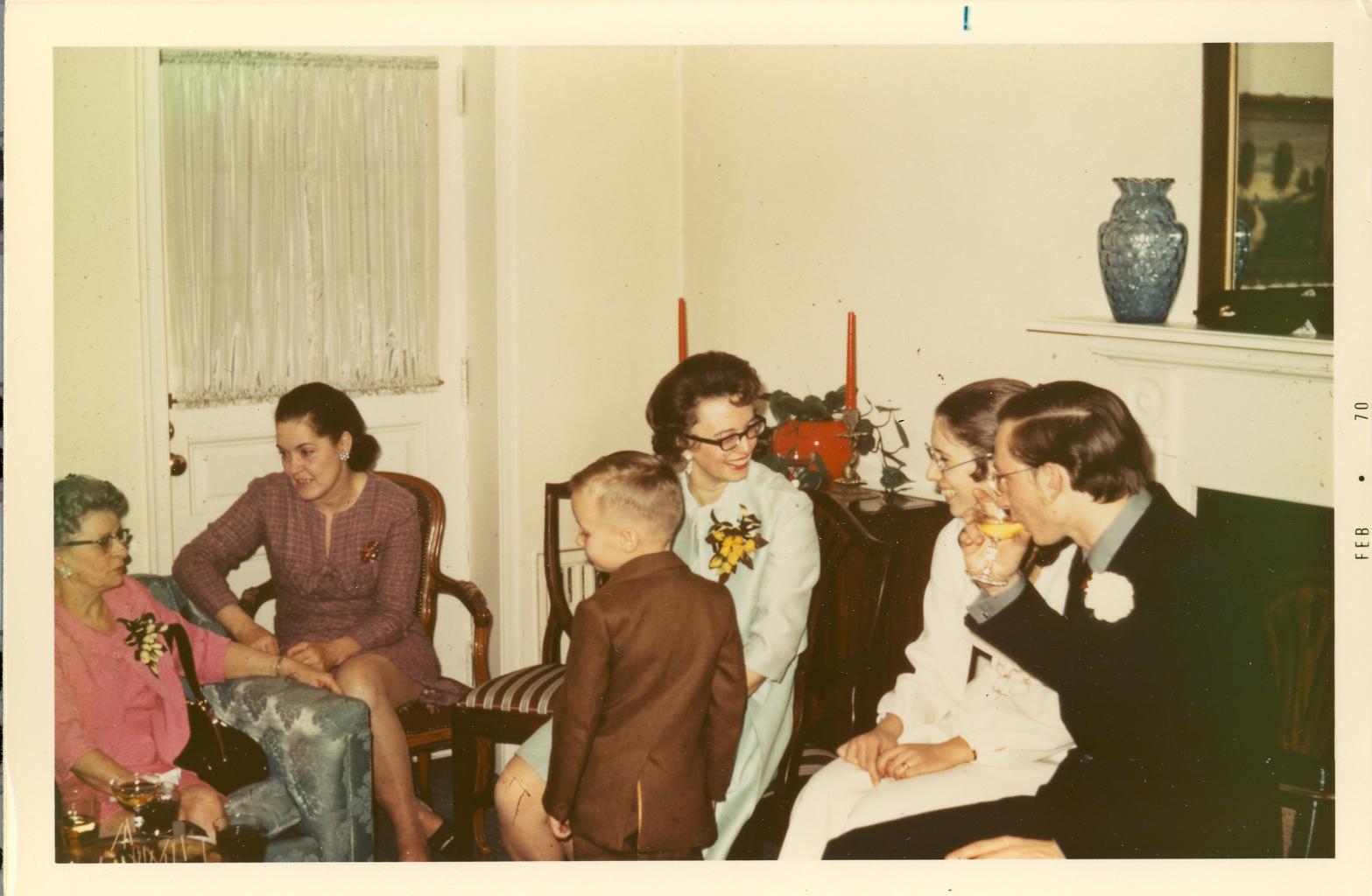 PicId: scan3048 Group: Wedding, Allen Johanna Where: Westport, CT When: 12-20-1969 Subject(s): Pauline Clingerman(Grandma Polly; Kathleen Kay Hershey; Johanna A. Hershey; Ernest Allen Hershey, III; Michael David Hershey Comments: Also present in this picture was Mrs. DeSchepper. Others at the wedding and reception following were Mrs. Nel Thiede (Johanna's sister) and Mr. and Mrs. Herb Cook (Tina, Johanna's sister). |
