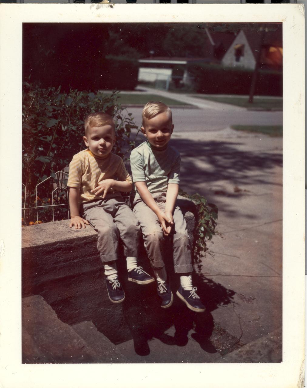 PicId: scan2288 Group: Misc Where: 798 Berkshire, Grosse Pointe, MI When: 07-01-1968 Subject(s): Michael David Hershey; Joseph Raymond Hershey Comments: Our two cute boys at side of house |
