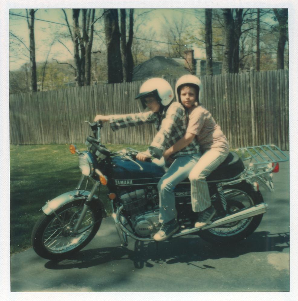 PicId: scan5148d Group: Album, Hersheys 1975-1977 Where: 9 Alger Place, Grosse Pointe, MI When: 08-15-1976 Subject(s): Michael David Hershey; Joseph Raymond Hershey Comments: Mike and Joe thinking they are big on Steve's motorcycle |