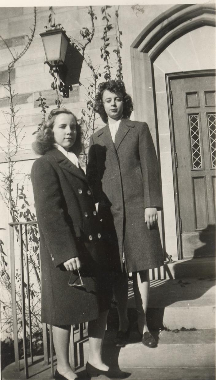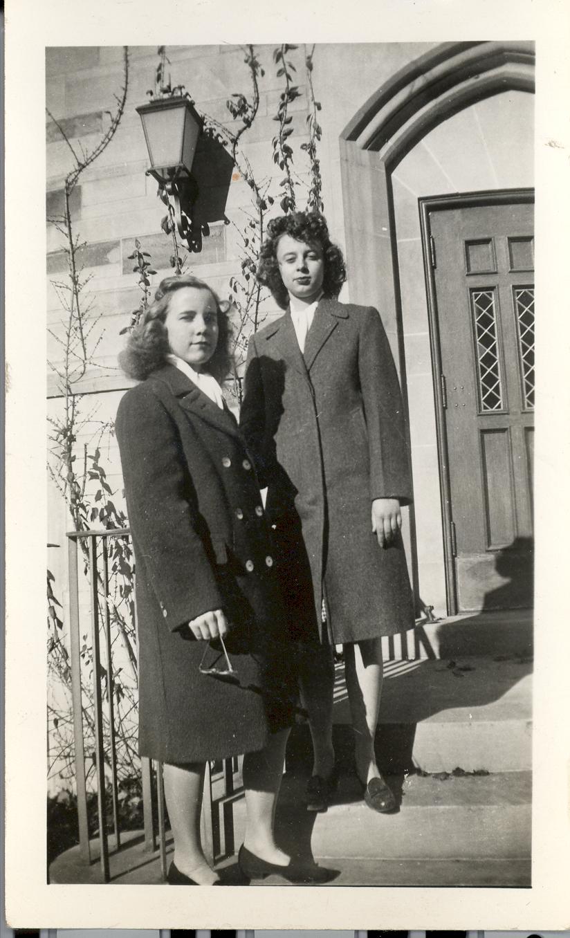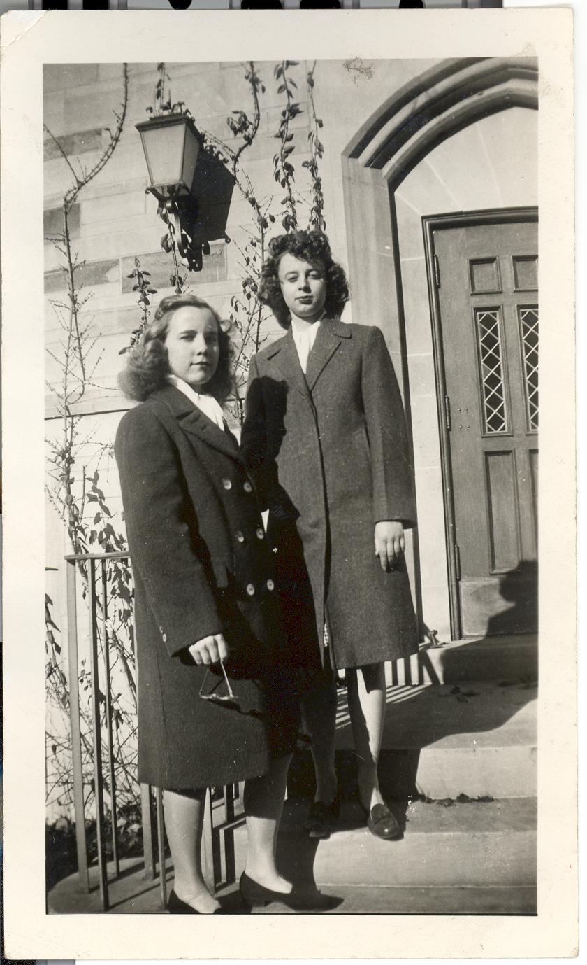 PicId: scan0067 Group: Misc Where: Bloomington, IN When: 07-01-1944 Subject(s): Kathleen Kay Hershey Comments: Mom & Miriam at Morrison Hall; first year college at IU at Bloomington |