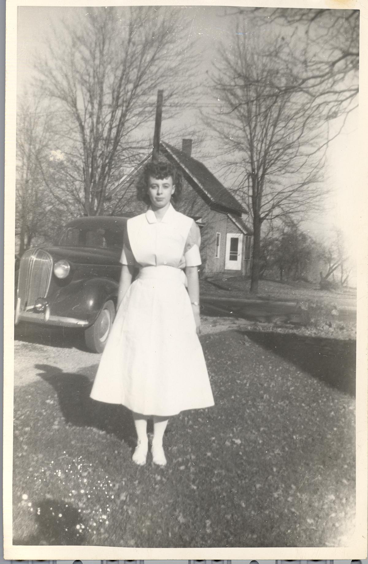 PicId: scan0047 Group: Misc Where: Grandma Polly's House, Churubusco, IN When: 07-01-1946 Subject(s): Kathleen Kay Hershey Comments: Mom in pink and white student nursing uniform at Polly’s |