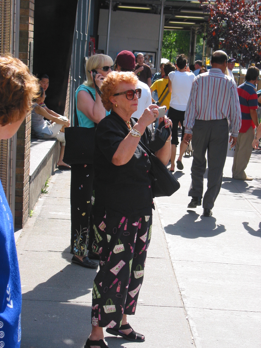 PicId: IMG_1215 Group: Trip, NJ Sep, 2003 Where: New York, NY When: 09-07-2003 Subject(s): Kathleen Kay Hershey; Kris Barski Comments: Looking at goods of all kinds for sale along street |