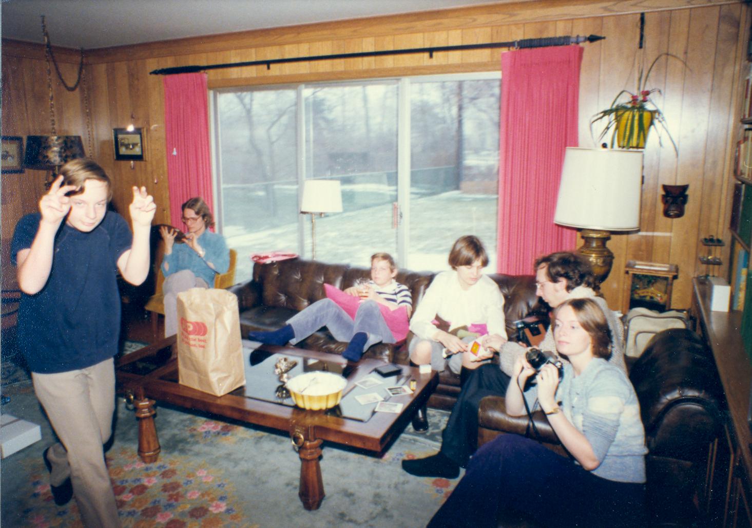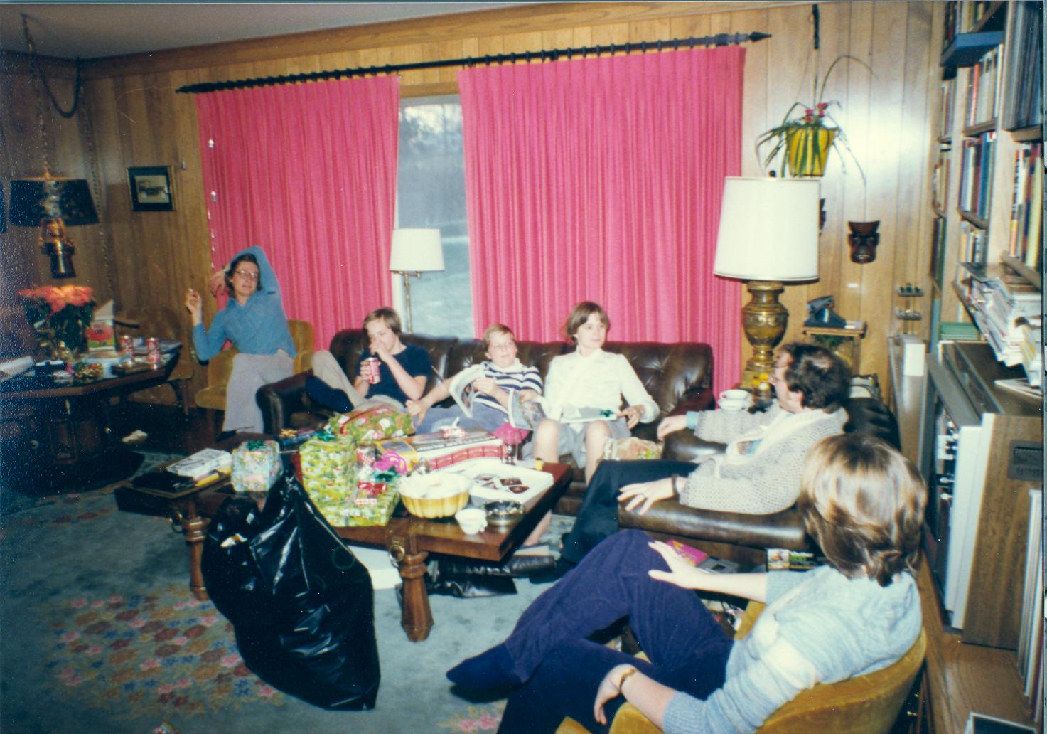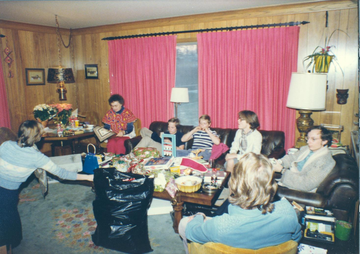 PicId: scan5306 Group: Christmas Where: 9 Alger Place, Grosse Pointe, MI When: 12-25-1977 Subject(s): Ernest Allen Hershey, III; Lucy Hershey; Stephen Douglas Hershey; Patricia Kay Hershey; Michael David Hershey; Joseph Raymond Hershey Comments: Everybody looking at gifts and Mike putting the hex on the camera taker |