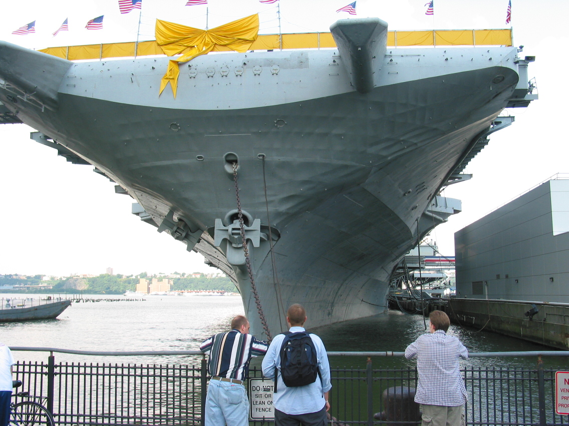 PicId: IMG_1164 Group: Trip, NYC Aug, 2003 Where: New York, NY When: 08-18-2003 Subject(s): Joseph Raymond Hershey; Ernest Allen Hershey, IV; Mark William Hershey Comments: Standing in from of the Intrepid - a BIG ship. Notice sign by Joe (then look at Joe and Mark). |