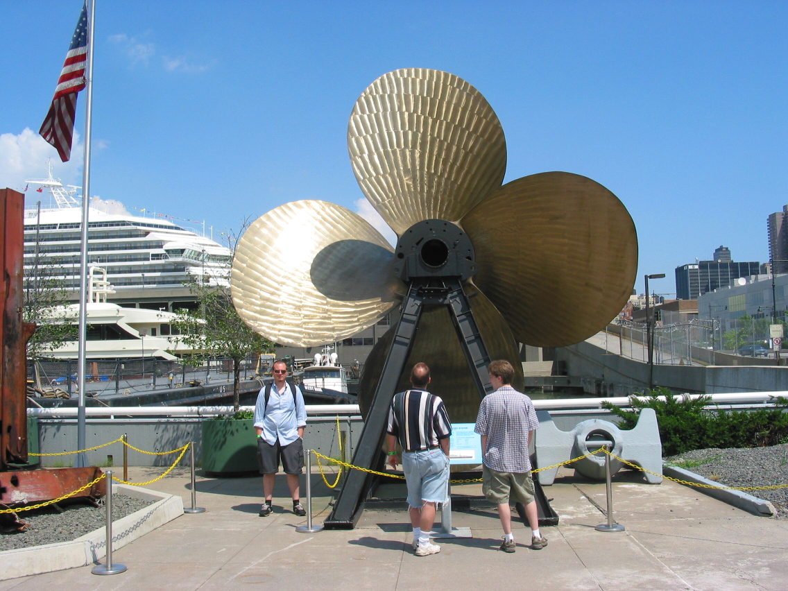 PicId: IMG_1166 Group: Trip, NYC Aug, 2003 Where: New York, NY When: 08-18-2003 Subject(s): Ernest Allen Hershey, IV; Joseph Raymond Hershey; Mark William Hershey Comments: In front of a propeller from a retired passenger liner. |