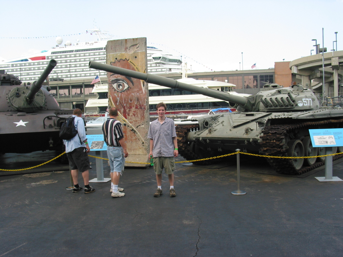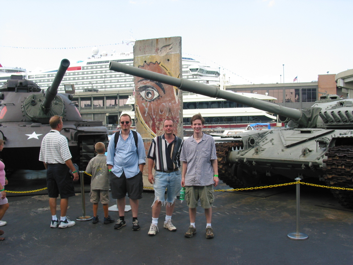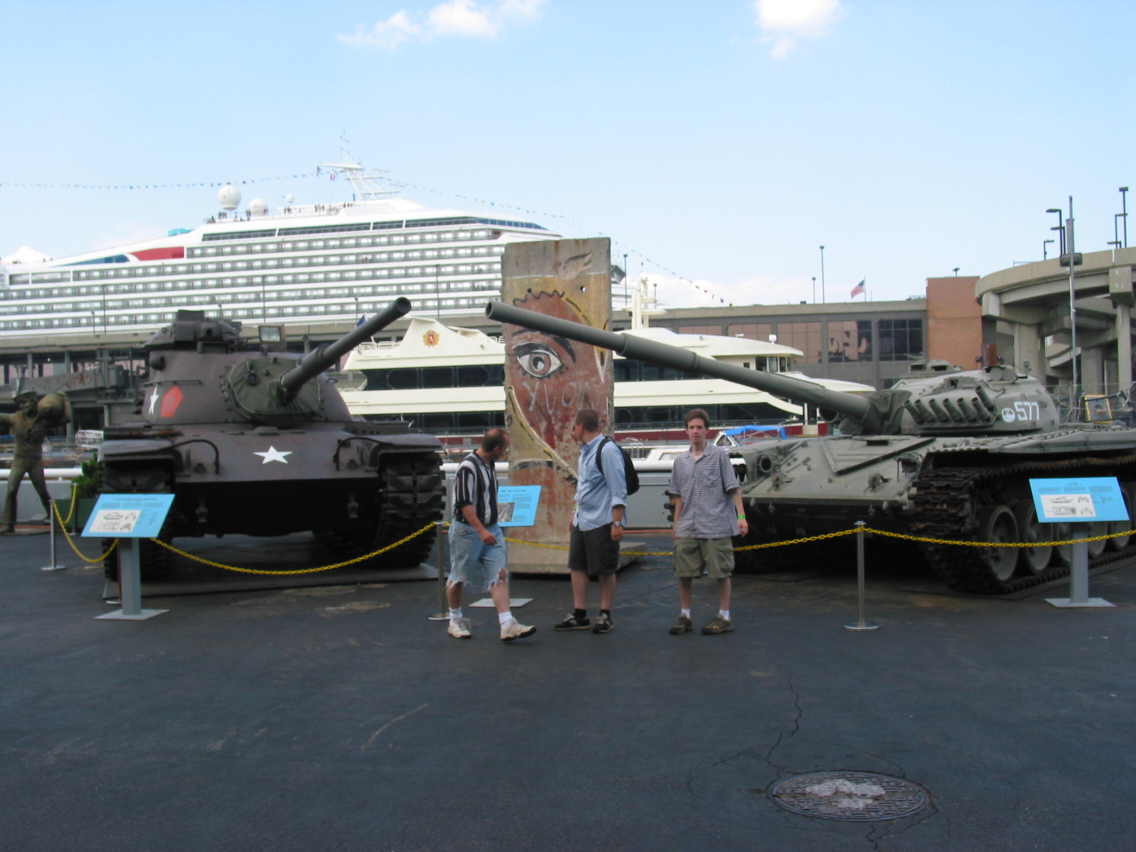 PicId: IMG_1182 Group: Trip, NYC Aug, 2003 Where: New York, NY When: 08-18-2003 Subject(s): Joseph Raymond Hershey; Ernest Allen Hershey, IV; Mark William Hershey Comments: A piece of the Berlin Wall between U.S. and Soviet tanks. |