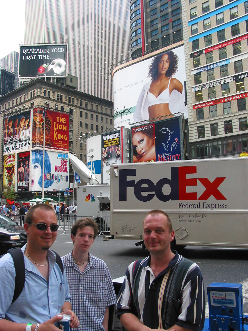 PicId: IMG_1185 Group: Trip, NYC Aug, 2003 Where: New York, NY When: 08-18-2003 Subject(s): Ernest Allen Hershey, IV; Mark William Hershey; Joseph Raymond Hershey Comments: Joe finally got to Times Square on foot - after driving thru it 3 times. |