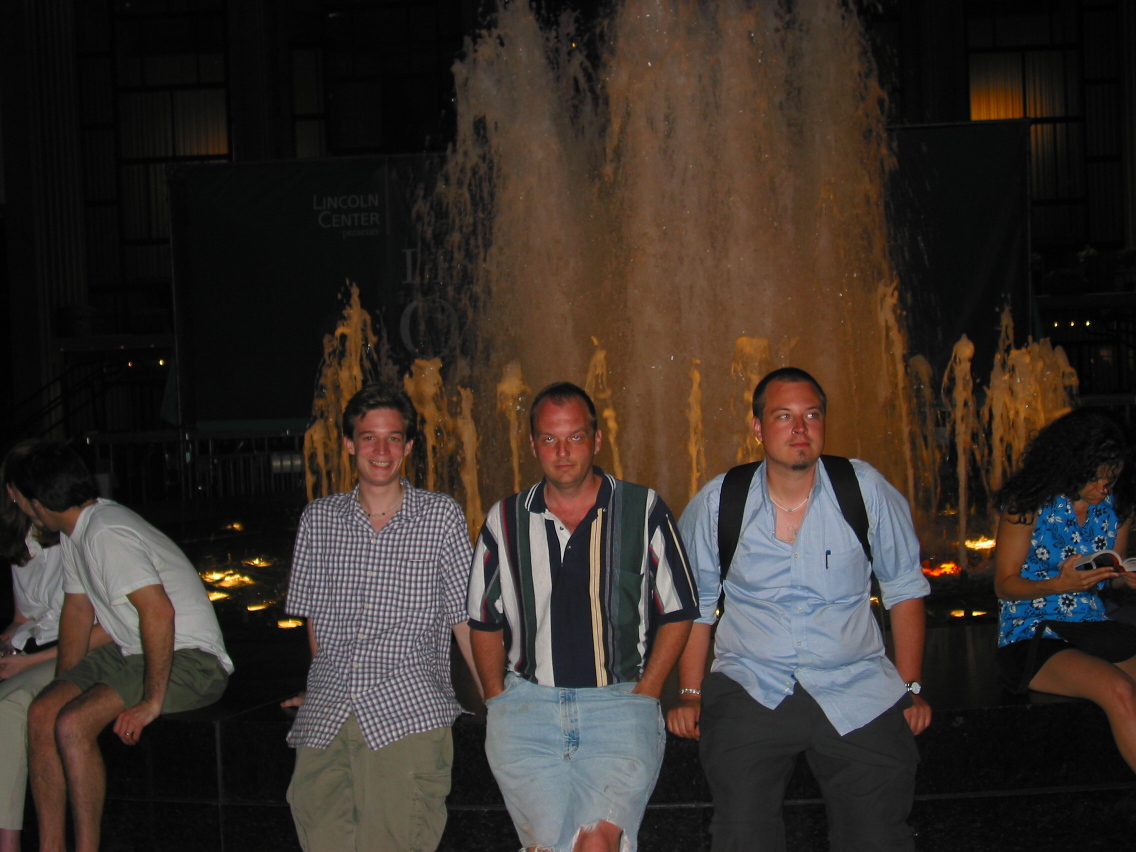PicId: IMG_1194 Group: Trip, NYC Aug, 2003 Where: New York, NY When: 08-18-2003 Subject(s): Mark William Hershey; Joseph Raymond Hershey; Ernest Allen Hershey, IV Comments: You'll have to take our word for it that this is the fountain in courtyard at Lincoln Center. |