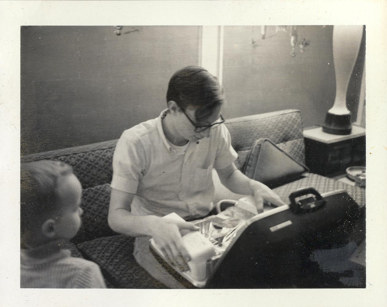 PicId: scan2267 Group: Misc Where: 798 Berkshire, Grosse Pointe, MI When: 07-01-1967 Subject(s): Ernest Allen Hershey, III; Michael David Hershey Comments: Probably Mike was wondering why Allen needed all the things in that suitcase to go to Great Britain |