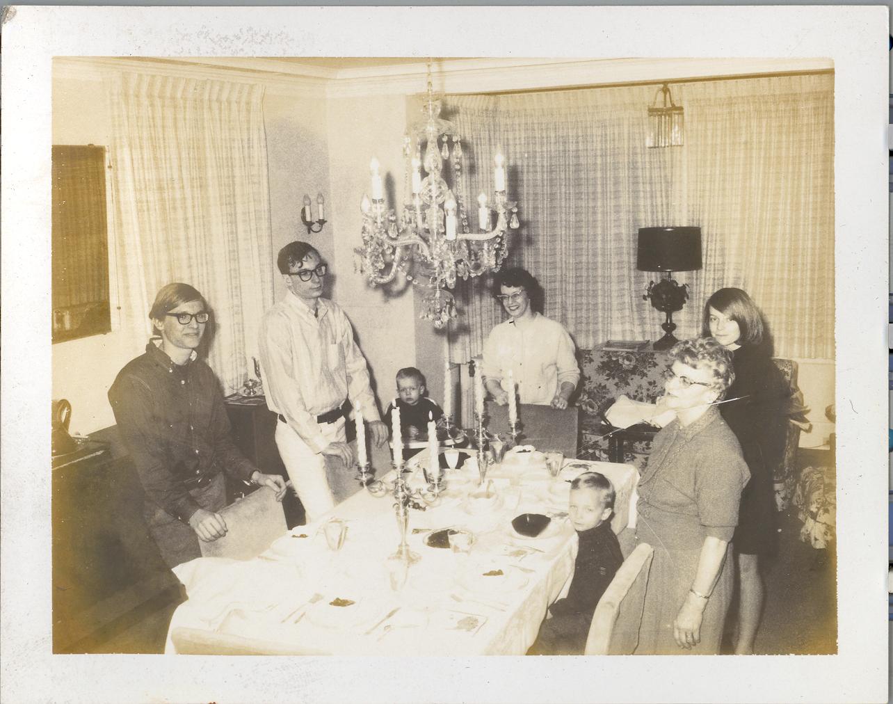 PicId: scan2286 Group: Misc Where: 798 Berkshire, Grosse Pointe, MI When: 07-01-1968 Subject(s): Kathleen Kay Hershey; Ernest Allen Hershey, III; Stephen Douglas Hershey; Patricia Kay Hershey; Michael David Hershey; Joseph Raymond Hershey; Pauline Clingerman(Grandma Polly Comments: Dad took picture of us all ready to sit down to eat in dining room, celebrating Grandma Polly's visit |