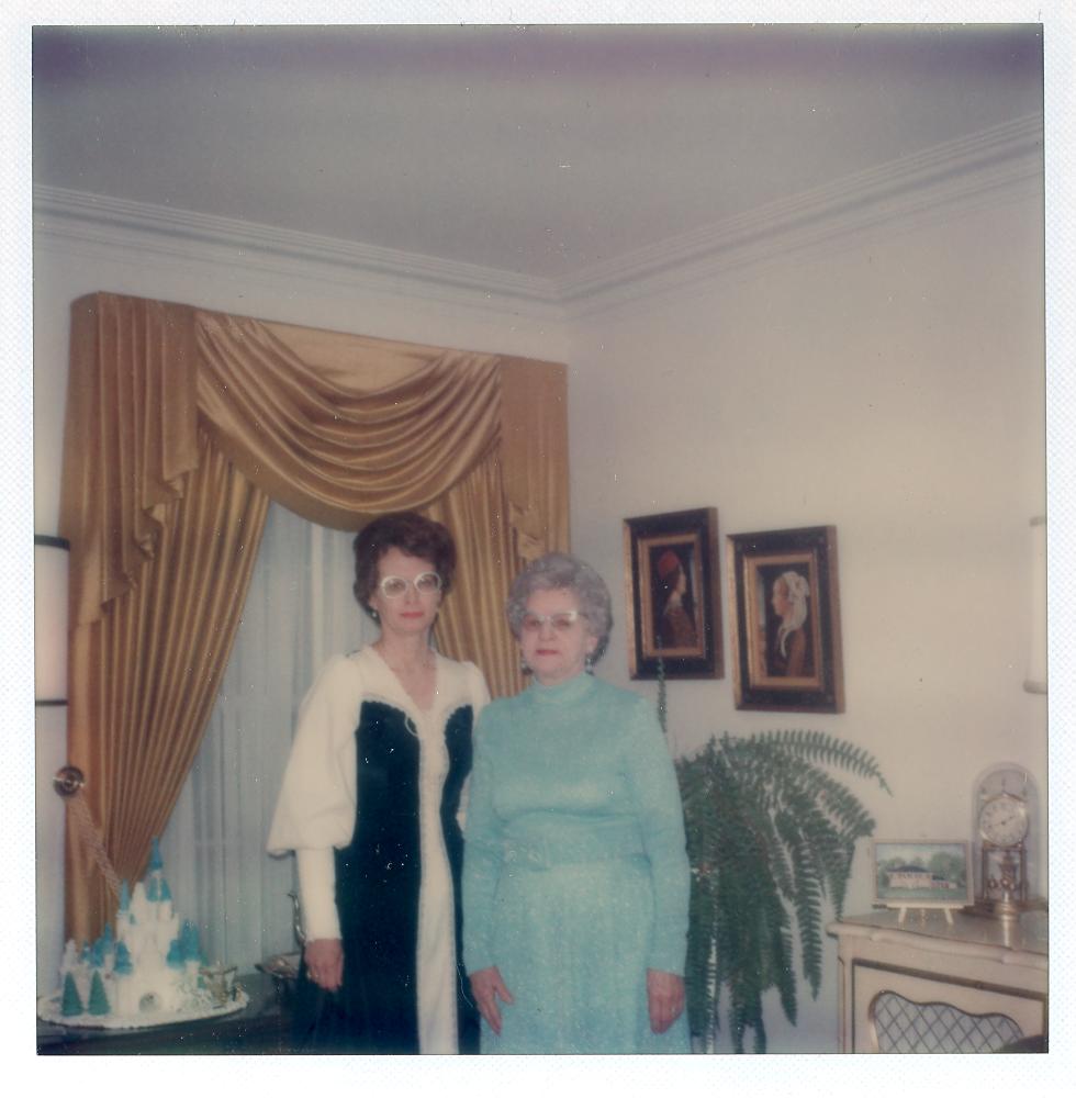 PicId: scan5107 Group: Album, Hersheys 1975-1977 Where: 9 Alger Place, Grosse Pointe, MI When: 12-15-1975 Subject(s): Kathleen Kay Hershey; Pauline Clingerman(Grandma Polly Comments: Mom and Polly ready to go to Church Christmas Dinner and program |