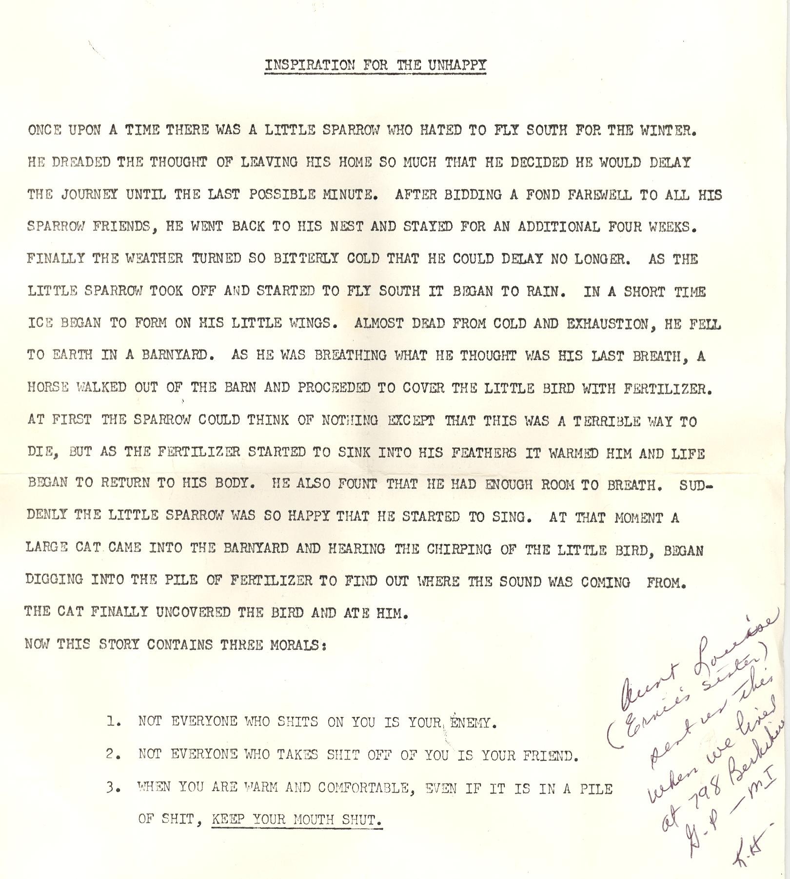 PicId: scan3071 Group: Misc Where: Unspecified When: Unspecified Subject(s): Unspecified Comments: Poem, "Inspiration to the Unhappy"--sent to us by Aunt Louise |