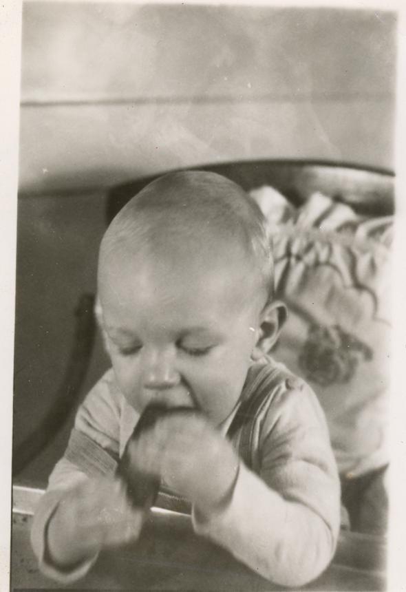 PicId: scan0042c Group: Misc Where: 10 Beals Street, Brookline, MA When: 07-01-1950 Subject(s): Ernest Allen Hershey, III Comments: Allen loved swiback--hard cracker |