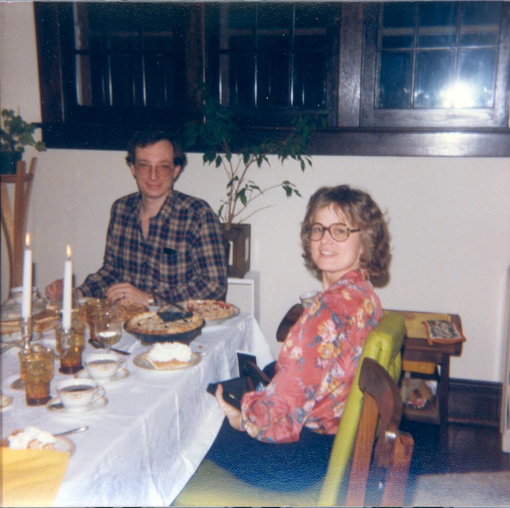 PicId: scan5405 Group: Album, Hersheys 1977-1979 Where: 1109 S. Forest, Ann Arbor, MI When: 11-15-1978 Subject(s): Ernest Allen Hershey, III; Lucy Hershey Comments: The host and hostess at Thanksgiving Day dinner--everything was delicious and table setting looked wonderful. |