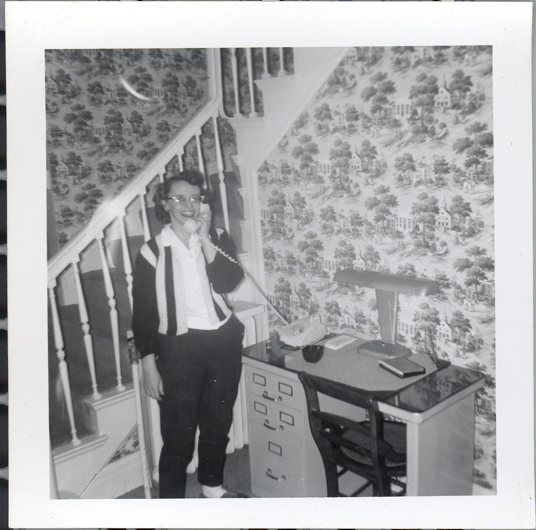 PicId: scan1079 Group: Unspecified Where: 798 Berkshire, Grosse Pointe, MI When: 07-01-1960 Subject(s): Kathleen Kay Hershey Comments: In front foyer--old wallpaper still on wall before Allen and Mom replaced it |