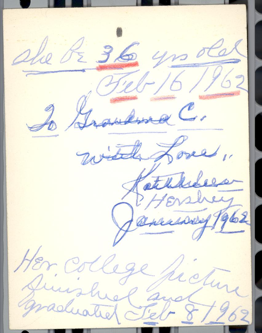 PicId: scan1044 Group: Misc Where: 798 Berkshire, Grosse Pointe, MI When: 07-01-1962 Subject(s): Kathleen Kay Hershey Comments: Grandma Clingerman’s notes (at age 90) on back of Mom’s graduation picture (from Wayne State University) |