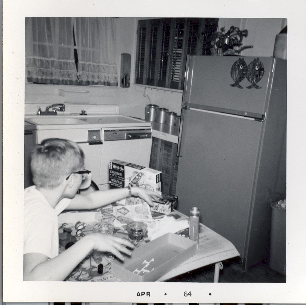 PicId: scan2011 Group: Misc Where: 798 Berkshire, Grosse Pointe, MI When: 07-01-1964 Subject(s): Stephen Douglas Hershey Comments: Steve putting together model digger in kitchen |