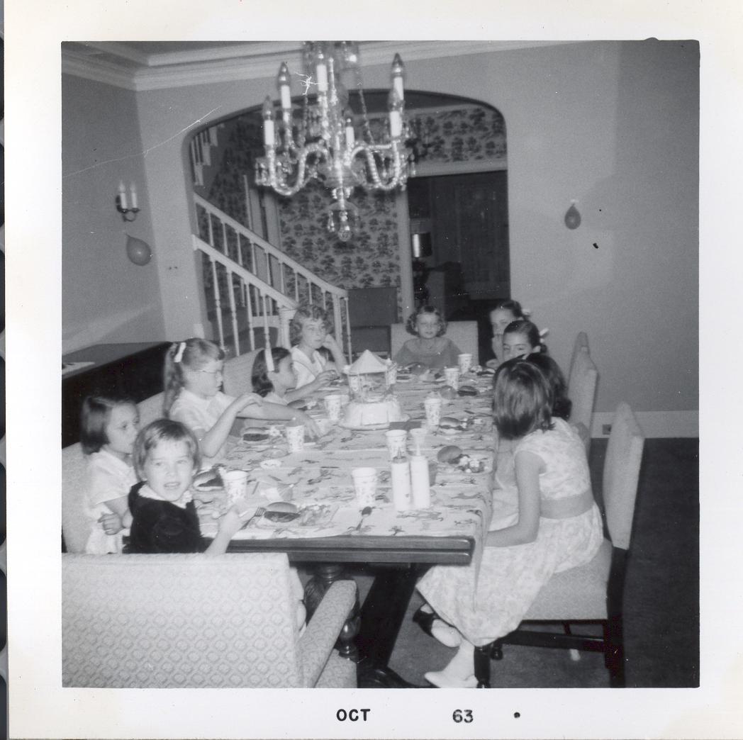 PicId: scan1241 Group: Birthday, Pat Where: 9 Alger Place, Grosse Pointe, MI When: 06-01-1963 Subject(s): Patricia Kay Hershey Comments: Friends at party and Pat at far end of dining room table |