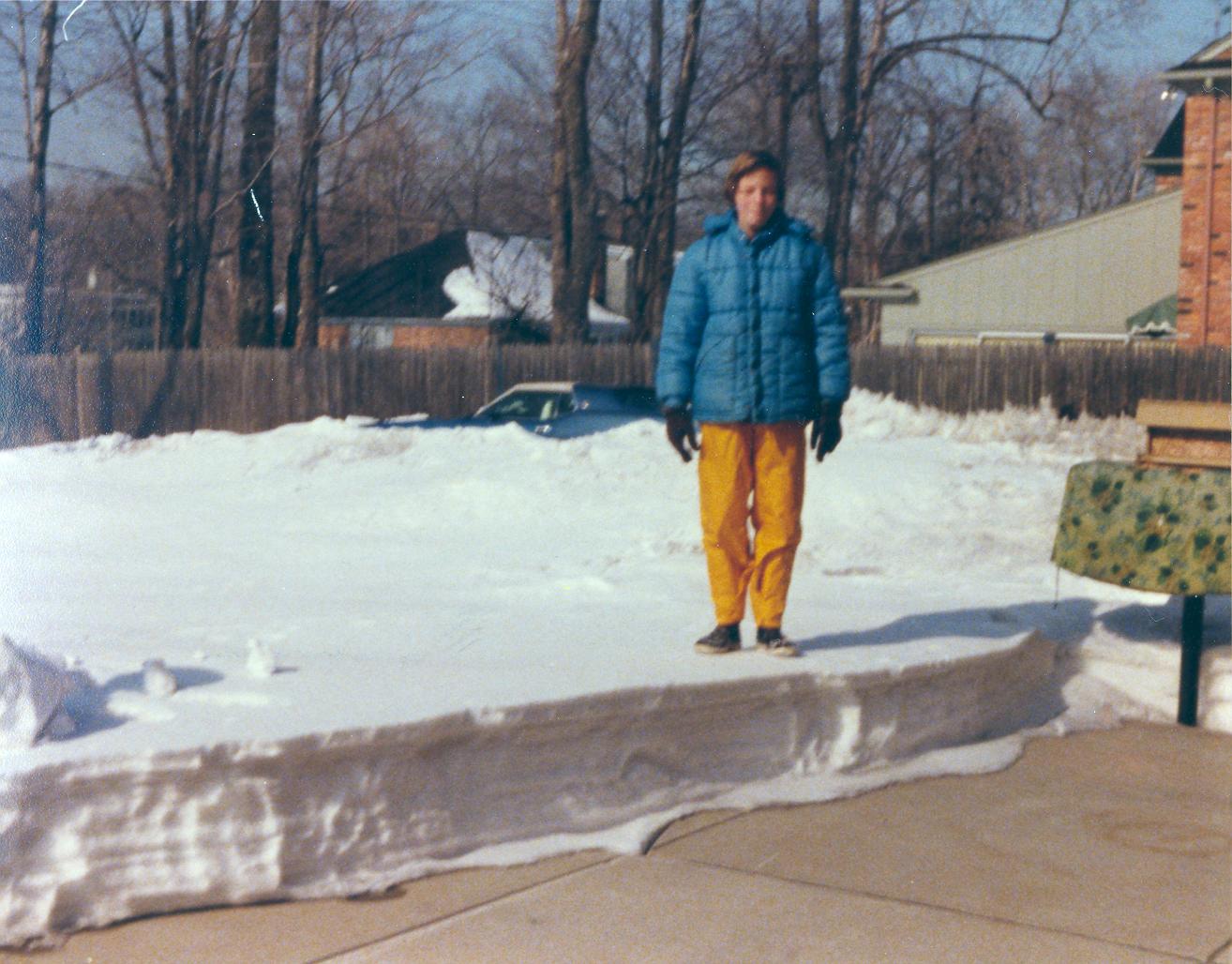 PicId: scan5326 Group: Album, Hersheys 1977-1979 Where: 9 Alger Place, Grosse Pointe, MI When: Unknown Subject(s): Michael David Hershey Comments: Mike standing on packed snow back of patio. One can see the bird feeder on grill at right |