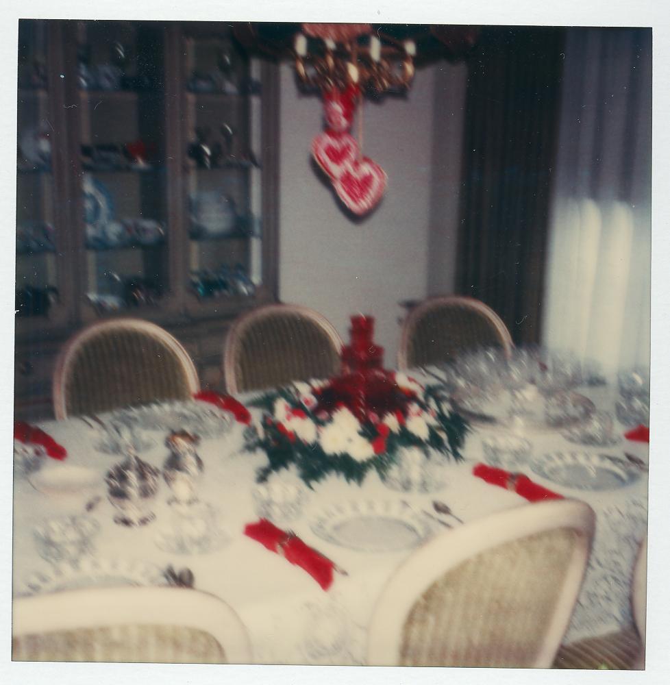 PicId: scan5327c Group: Album, Hersheys 1977-1979 Where: 9 Alger Place, Grosse Pointe, MI When: Unknown Subject(s): Unspecified Comments: Dining room table set for Valentine's day, Mike's Birthday and Mom's birthday |