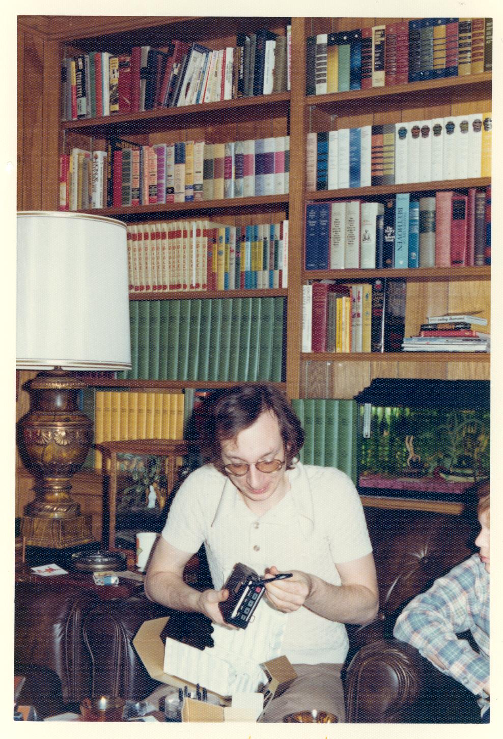 PicId: scan5132 Group: Album, Hersheys 1975-1977 Where: 9 Alger Place, Grosse Pointe, MI When: 12-25-1975 Subject(s): Ernest Allen Hershey, Jr.; Kathleen Kay Hershey Comments: Dad pleased with new book |