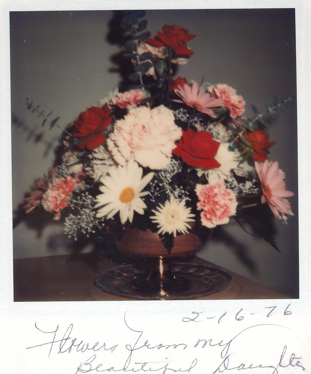 PicId: scan5141d Group: Album, Hersheys 1975-1977 Where: 9 Alger Place, Grosse Pointe, MI When: 02-16-1976 Subject(s): Unspecified Comments: Birthday flowers for mom (50 years old) from Pat |