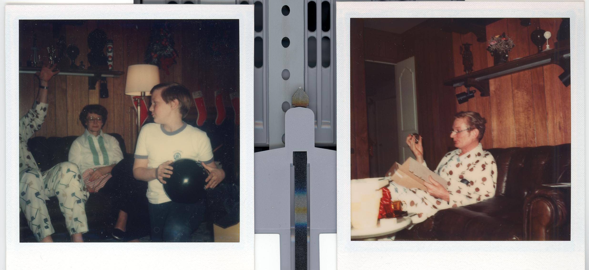PicId: scan5169a Group: Album, Hersheys 1975-1977 Where: 9 Alger Place, Grosse Pointe, MI When: 12-25-1976 Subject(s): Joseph Raymond Hershey; Kathleen Kay Hershey; Ernest Allen Hershey, Jr. Comments: Joe with new bowling ball for Xmas |