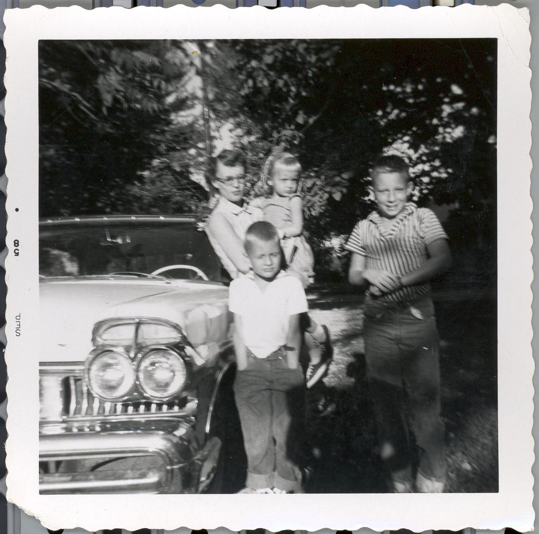PicId: scan0168 Group: Misc Where: Circle, Churubusco, IN When: 07-01-1958 Subject(s): Kathleen Kay Hershey; Ernest Allen Hershey, III; Stephen Douglas Hershey; Patricia Kay Hershey Comments: Mom & kids getting ready to move to Detroit from Busco (Pat had long curls because Mom did her hair up in rags) |