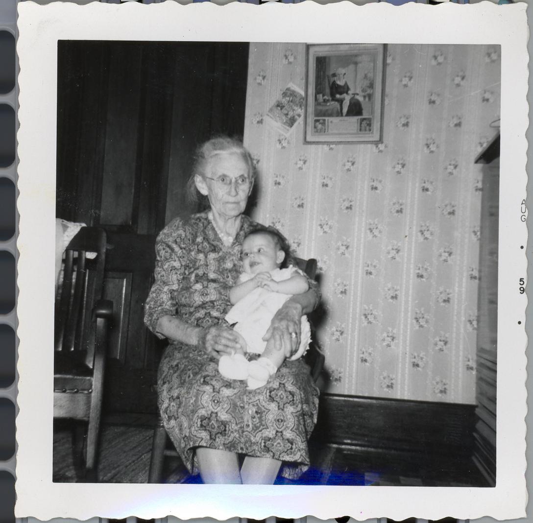 PicId: scan1024 Group: Misc Where: Cromwell, IN When: 07-01-1959 Subject(s): Unspecified Comments: Grandma Clingerman & Tammy at Grandma C’s in Cromwell, IN |