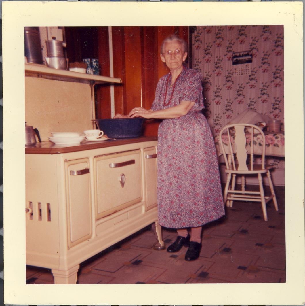 PicId: scan1267 Group: Misc Where: Cromwell, IN When: 04-29-1961 Subject(s): Grandma Clingerman Comments: Grandma in her kitchen |