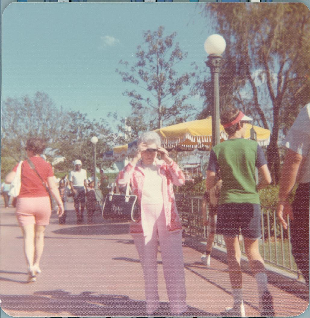 PicId: scan5060 Group: Trip, Florida Jan 1974 Where: Florida When: 01-15-1974 Subject(s): Pauline Clingerman(Grandma Polly Comments: Polly taking pictures at Disney World |