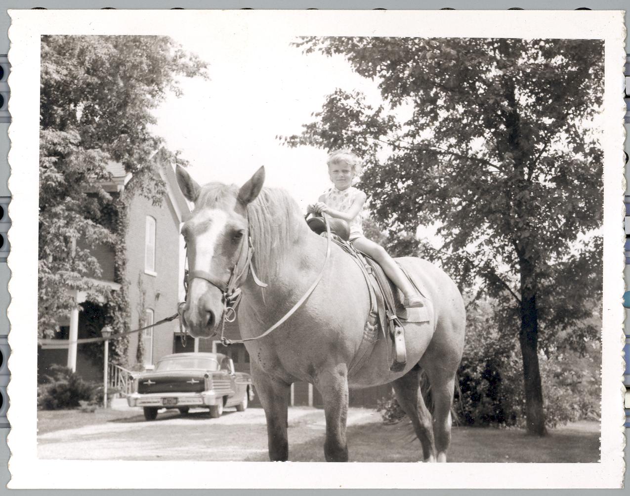 PicId: scan1017 Group: Misc Where: Flowers Farm, Churubusco, IN When: 07-01-1959 Subject(s): Patricia Kay Hershey Comments: Pat on horse at Marcia’s family home (Bowers) |