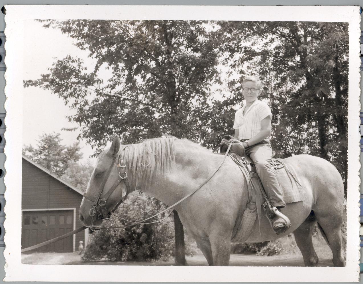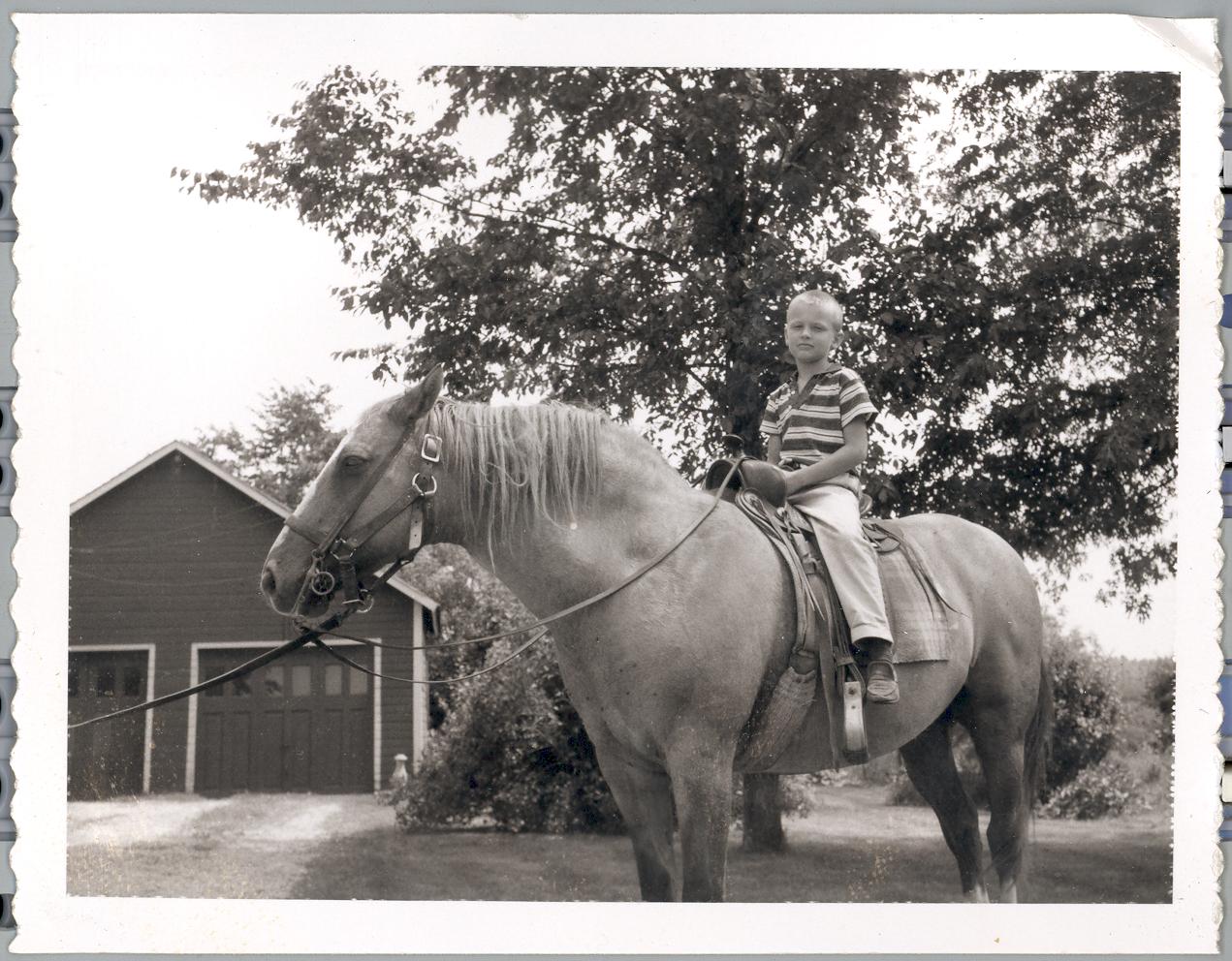PicId: scan1019 Group: Misc Where: Flowers Farm, Churubusco, IN When: 07-01-1959 Subject(s): Stephen Douglas Hershey Comments: Steve on horse at Marcia’s family home (Bowers) |